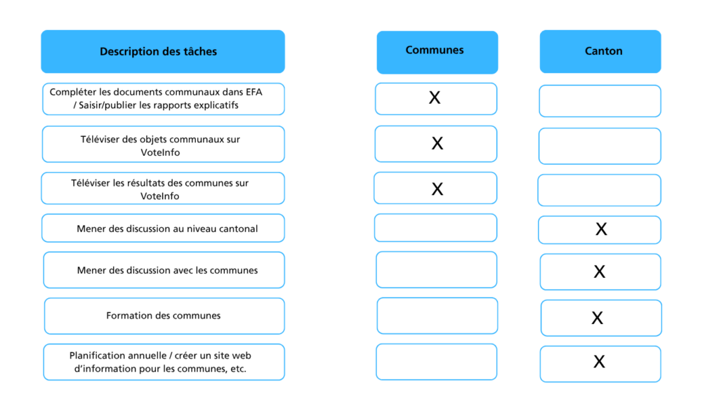 Le tableau ci-dessous indique les tâches prises en charge par la commune ou le canton :