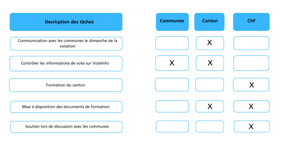 La Chancellerie fédérale est l’interlocutrice de tous les cantons. Elle est responsable de la coordination générale entre les partenaires techniques et élabore, en concertation avec les parties concernées, un calendrier global de l’intégration des communes.
