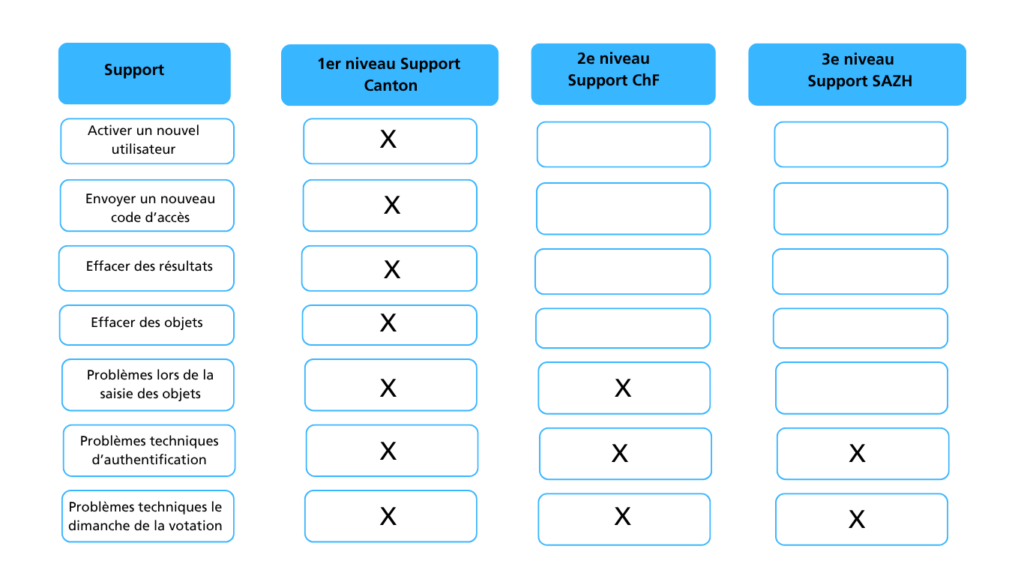La Chancellerie fédérale offre son assistance uniquement aux dates fixées. Tous les autres dimanches, les demandes seront traitées le lendemain, qu’il s’agisse d’une élection ou d’une votation. En participant à l’intégration, vous acceptez que l’assistance ne soit assurée que lors des quatre dates fixées.