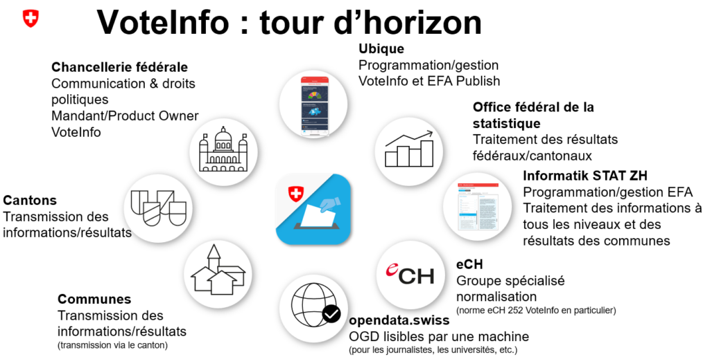 L’Office fédéral de la statistique (OFS) est responsable du traitement des résultats des votations. Ce dernier prépare les résultats des votations tant fédérales que cantonales pour l’application.